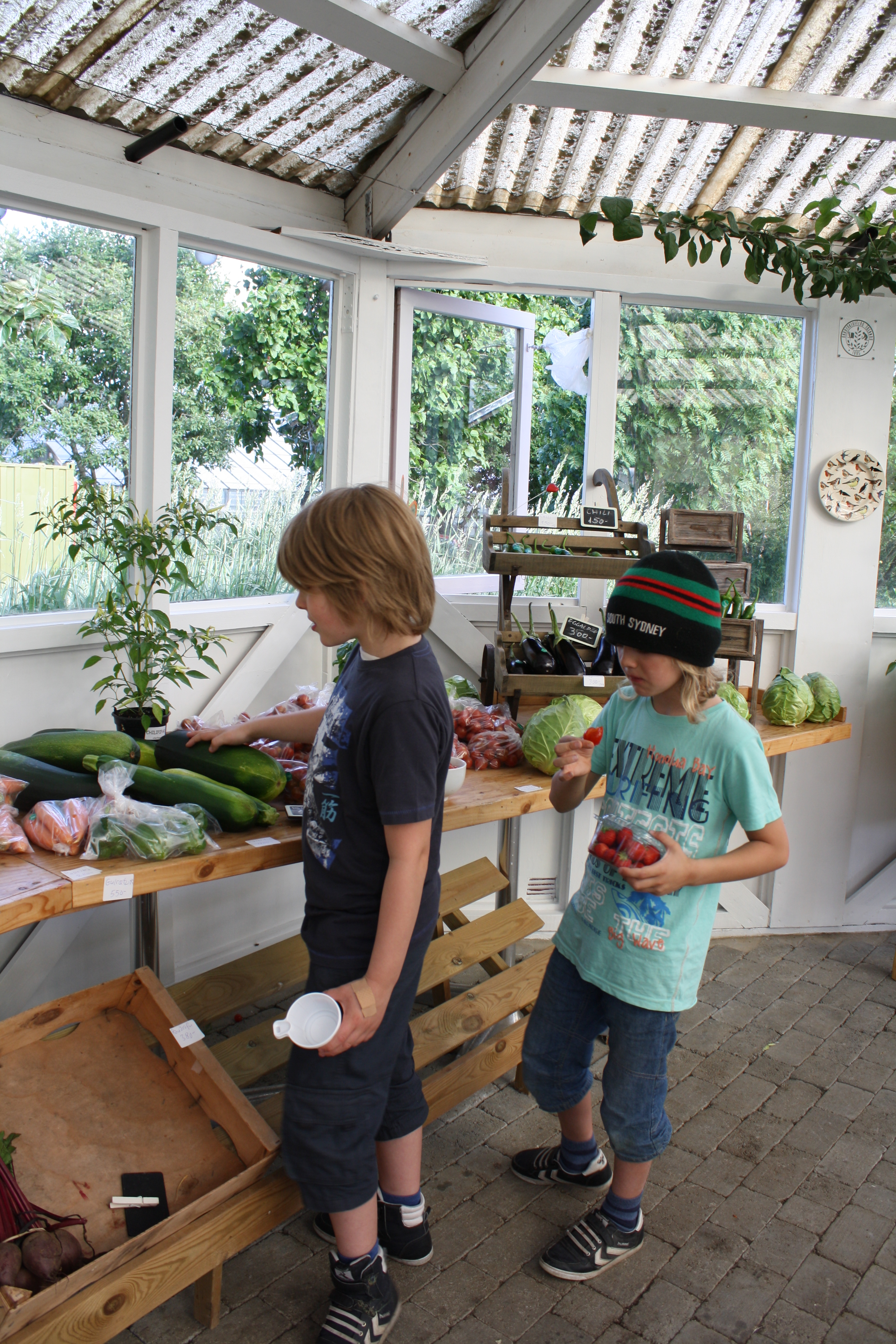 Á staðnum er einnig mikið úrval af grænmeti, ávöxtum og kryddjurtum og í boði var myntute úr stórum sniðugum tekatli. Það var mjög notalega að rölta um ilmjurtagarðinn á þessum fallega degi og rákumst við bæði á kisu og íslenska landnámshænu. Það voru því ánægð börn sem fóru heim með poka af gómsætum ávöxtum og grænmeti eftir skemmtilegan dag.